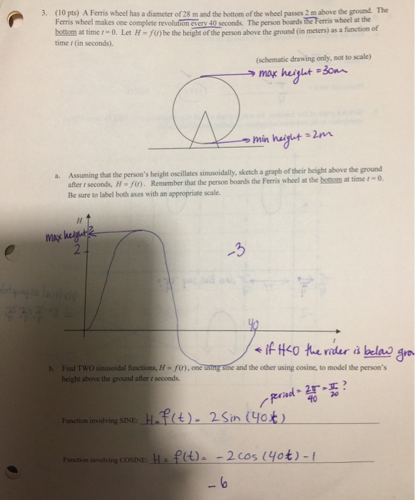 Ferris Wheel (revisited) A Ferris Wheel and rotates once every three minutes. Th en eraxeo t e erns 1. Using the axes below, sketch a graph to show how the height of a passenger will vary with time. Assume the wheel starts rotating whe . Ht (m) 100 90 80 70 60 50 40 20 10 T (min) 2. A mathematical model for this motion can be given by the formula:
