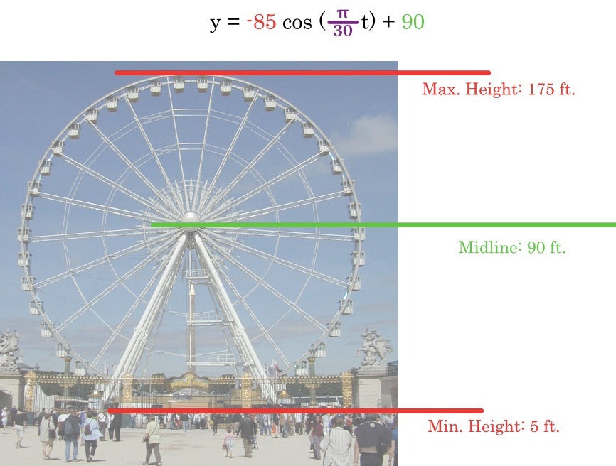 Example1. A Ferris wheel has a diameter of 30 m with its center 18 m above the ground. It makes one complete rotation every 60 seconds. Assuming rider starts at the lowest point, find the trigonometric function for this situation and graph the function. Solution: Amplitude - radius of the wheel makes the amplitude so amplitude(a) = 30/2 =15.