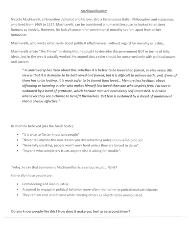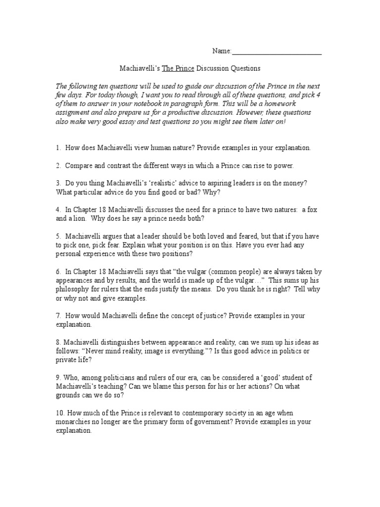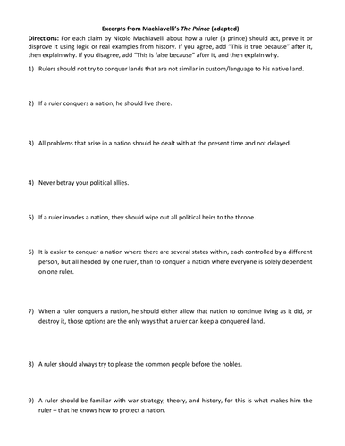 The Prince by Machiavelli worksheet. This sheet presents 9 claims by Machiavelli (adapted so the students can understand them more easily) and asks students to either agree or disagree with each claim and explain why using logic or examples from history we have learned. Report this resource to let us know if it violates our terms and conditions.