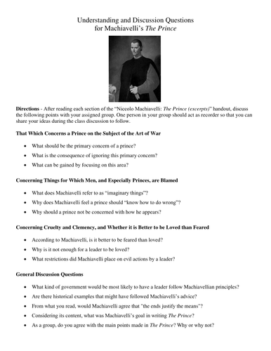 Epic History Worksheets. 3. $2.75. Zip. Niccolo Machiavelli - The Prince worksheetPrimary source excerpts from Machiavelli from his famous book, The Prince. Followed by 4 critical thinking/analysis questions perfect for class discussion and active engagement!Works well as an in-class activity or as a homework assignment.