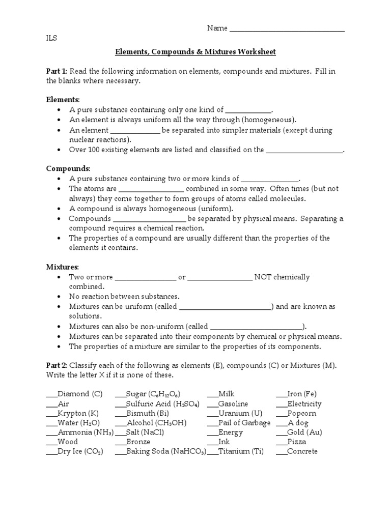 Elements and compounds these worksheets are for grade 7 students to help them review the topic elements and compounds. Fill in the blanks where necessary. Elements compounds and mixtures worksheet. The elements compounds and mixtures worksheet answer key trap together protons and neutrons are called nucleons.