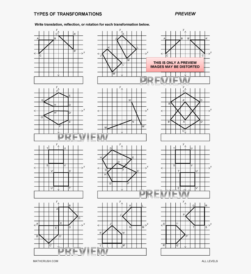 Encompassing basic transformation practice on slides flips and turns and advanced topics like translation rotation reflection and dilation of figures on coordinate grids these pdf worksheets on transformation of shapes help students of grade 1 through high school sail smoothly through the concept of rigid motion and resizing. 1 reflection ...