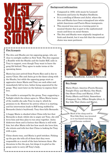 File previews. docx, 151 KB. A one page sheet giving basic information on West Side Story, including a brief plot summary, list of key songs and some background information. Tes classic free licence. Report this resource to let us know if it violates our terms and conditions. Our customer service team will review your report and will be in touch.