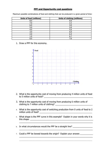 This worksheet is an introduction to opportunity cost. In this activity, students are to fill in the table with the number of items, and total cost of items desired. In addition, money can also be saved. The total should equal the amount at the bottom of the page, as all money should be either spent or saved. This is a random worksheet. Define Opportunity Cost as the next-best alternative a person gives up in making a choice, or the thing the person chooses not to do. Note for students the importance of making financial decisions to spend or save consistent with one's values, and of always considering the opportunity cost of spending choices as a way to make an informed ... 4.The opportunity cost of moving from f to c is… 3.The opportunity cost of moving from d to b is… 7 Bikes. 4 Computer. 0 Computers. 5.What can you say about point G? Unattainable. 1. The opportunity cost of moving from a to b is…