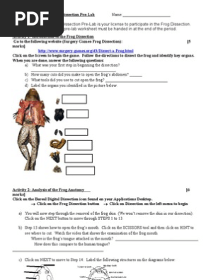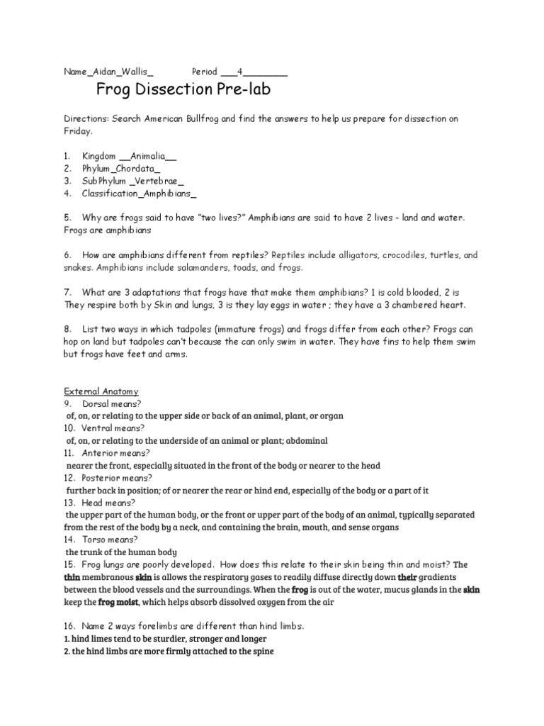 Start studying Frog Dissection Pre-Lab Questions. Learn vocabulary, terms, and more with flashcards, games, and other study tools. Your completed pre-lab worksheet must be handed in at the end of the period. Activity 1: Introduction to the Frog Dissection Go to the following website ... Directions: Read the following information about dissections and about frogs. Then, answer the pre-lab questions. Important Dissection Vocabulary: Dissect: to ... Frog Dissection Pre-lab. Directions: Watch the virtual Dissection “Introduction” & “External Anatomy” to answer the questions. Use the second web link to label the frog’s internal organs with location and function. Expect to take about an hour to prepare for this dissection. Kingdom _____