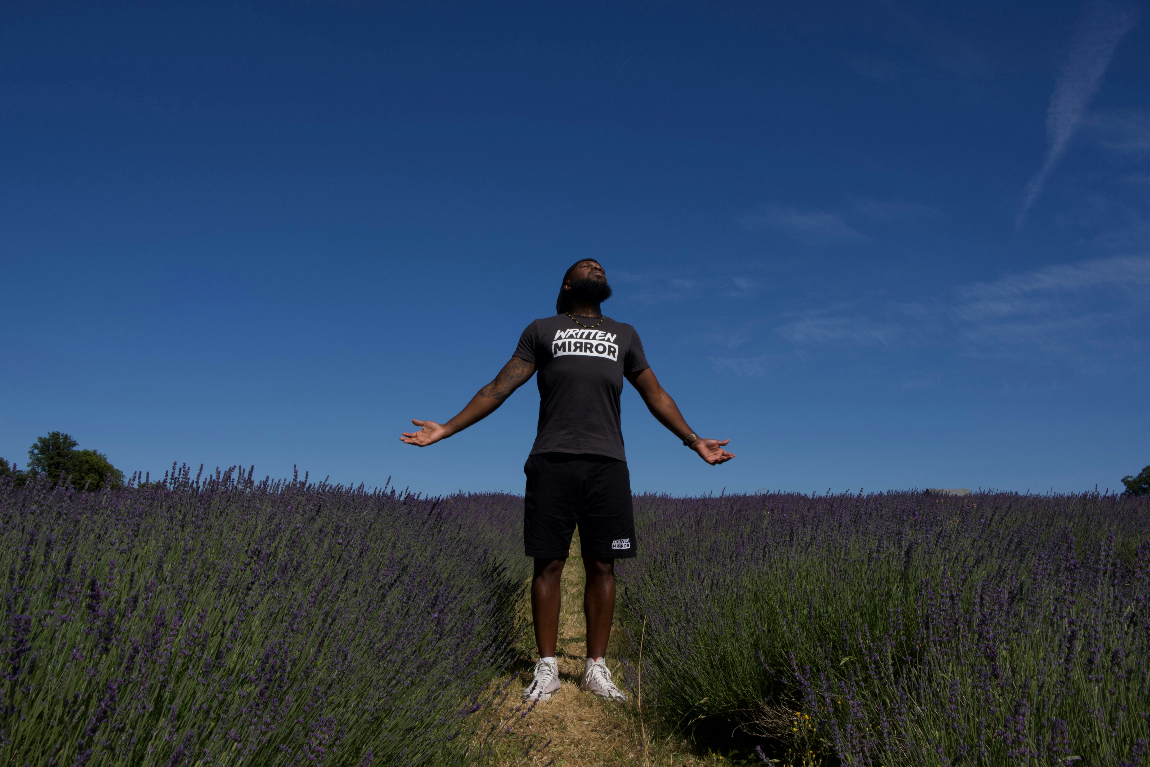 A man at peace. Lavender fields calming effect visibly working... Blue skies and Lavender what else could a guy ask for?