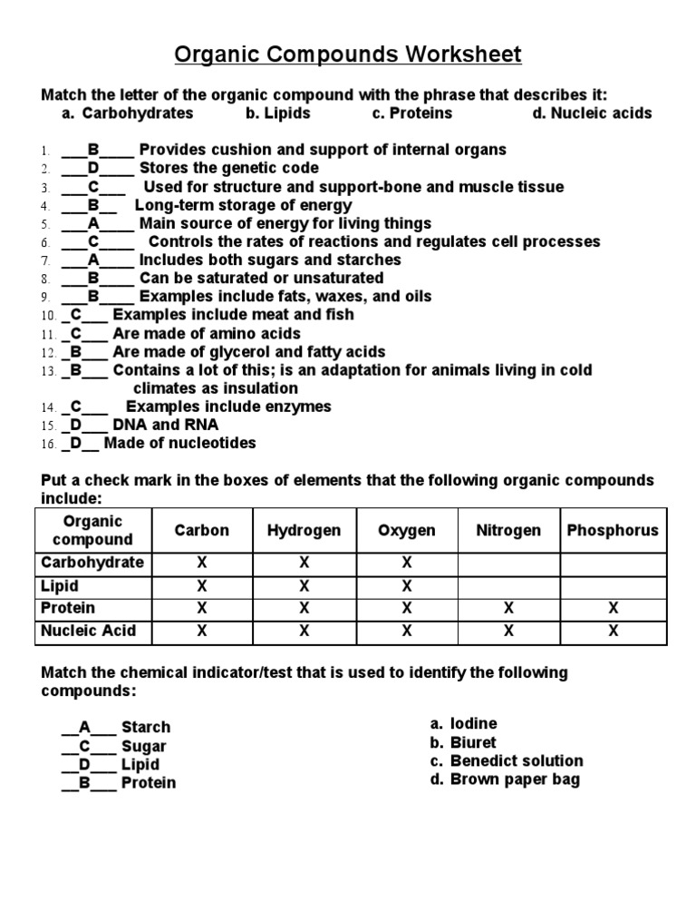 Biomolecule Review Worksheet Biomolecule Review Worksheet ORGANIC MOLECULES Organic molecules are the molecules which exist in all living things. They are life’s building blocks. All things are formed from these organic molecules. There are four categories of organic molecules: Carbohydrates, lipids, proteins and nucleic acids. 1. Chapter 2 The Chemistry of Life Worksheets Carbohydrates sugars,starches carbon,hydrogen,oxy-gen providesenergytocells, stores energy, forms bodystructures Lipids fats,oils carbon,hydrogen,oxy-gen stores energy, forms cellmembranes,carries messages Proteins enzymes,antibodies carbon,hydrogen,oxy-gen,nitrogen,sulfur helps cells keep their shape, makesupmus-cles,speedsupchemical … study.com › academy › lessonWhat Are Macronutrients? - Definition, Functions ... - Study.com Aug 30, 2021 · Proteins that do not contain all nine essential amino acids are considered 'low quality' proteins, and tend to come from plant sources. Lipids Currently, the USDA recommends 20% - 35% of calories ... › grades › 7th_grade7th Grade Free Science worksheets, Games and Quizzes Free Science worksheets, Games and Projects for preschool, kindergarten, 1st grade, 2nd grade, 3rd grade, 4th grade, 5th grade and 6th Grade kids