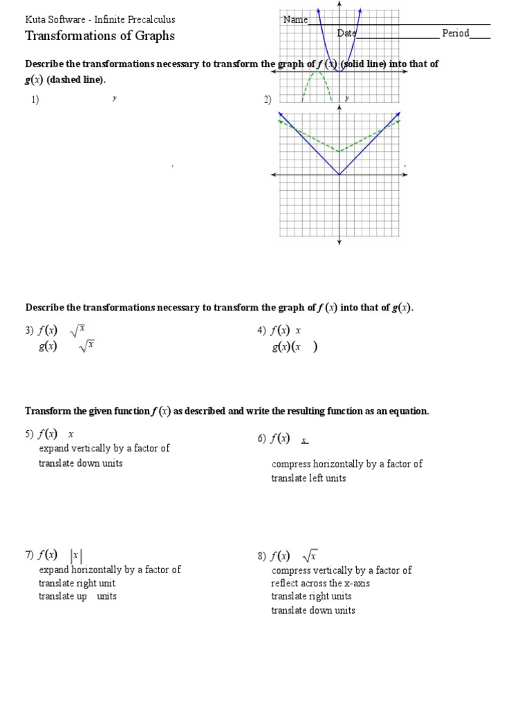 Transformations of Graphs - Kuta Software Transformations of Graphs. Date_ Period____. Transform the given function f (x) as described and write the resulting function as an equation. 5) f (x) = x2. expand vertically by a factor of 3 translate down 3 units.