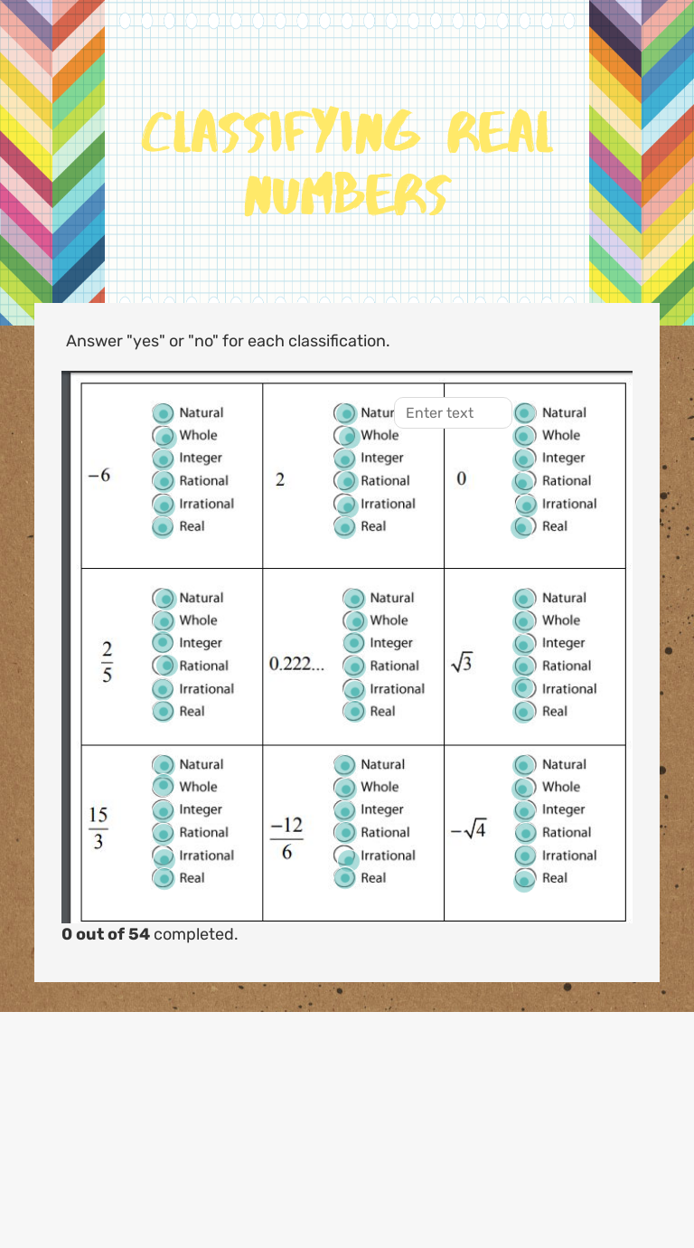 Classifying Real Numbers Worksheets | Online Free PDFs Classifying real numbers worksheets are one of the most fundamental concepts from a mathematics point of view. Real numbers are those numbers that can be represented in a number line or a graph. The number, which has a negative radicand is not a real number, and it can't be represented in a number line (for example; 5√-3 is not a real number).