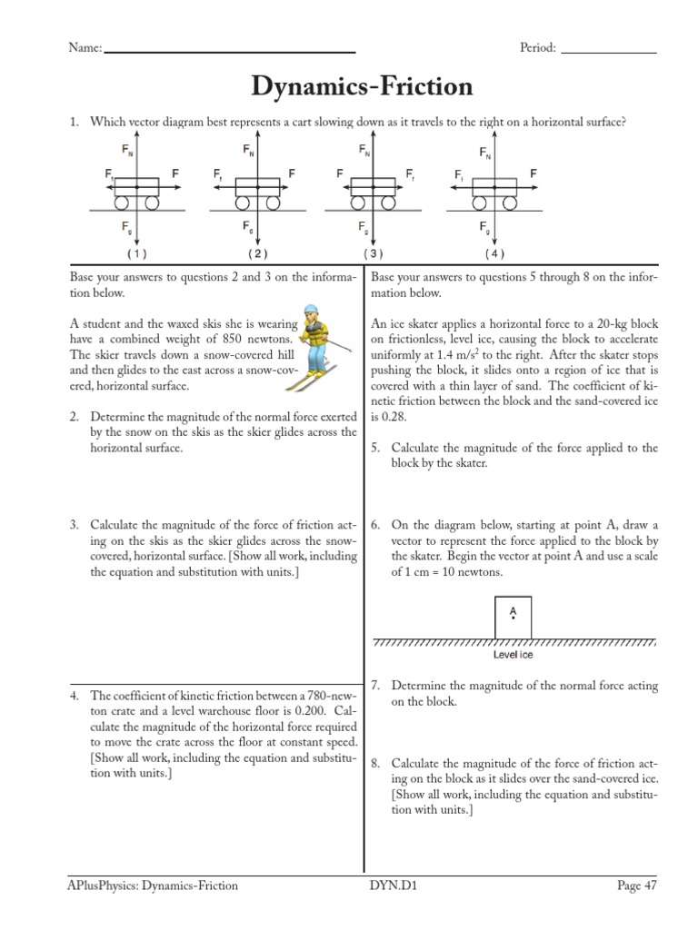 Friction : Worksheet Std 8 Physics Chapter-2 | CBSE Get the handouts of prepared worksheet for "Friction" Chapter-2 of Physics CBSE Std-8. Explain your answer in the light of friction. Ans - If we step on a peel of banana, we may slip or fall down as there is less friction between peel and surface of road. Dynamics Friction Answers Dynamics Friction Worksheet Answers , Jobs EcityWorks. News Post. Details: Dynamics-Friction APlusPhysics: Dynamics-Friction DD Page 3 Base your answers to questions 17 through 21 on the in-formation and diagram below. PDF Name | Dynamics-Friction APlusPhysics: Dynamics-Friction. DYN.D1. Page 47. Name: Period: Dynamics-Friction. Base your answers to questions 9 through 13 on the in- Base 43. A .50-kilogram puck sliding on a horizontal shuffle-board court is slowed to rest by a frictional force of 1.2 newtons. What is the coefficient of... Dynamics Friction Worksheet Answers , Jobs EcityWorks Dynamics friction worksheet answers. Dynamics newtons second law answer key. All worksheets with keys. Dynamics friction worksheet answers. Dynamics newtons 1st law 11. Which vector diagram best represents a cart slowing down as it travels to the right on a horizontal surface.