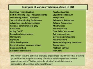 › self-help › what-is-cbtWhat is Cognitive Behavioral Therapy (CBT ... - Psychology Tools Unfortunately, safety behaviors often have the effect of maintaining anxiety because they can prevent learning about actual outcomes. CBT therapists might employ metaphors or CBT worksheets to explain what safety behaviors are, how they operate, and why they are unhelpful. The CBT safety behaviors worksheet is a concise and helpful tool for ...