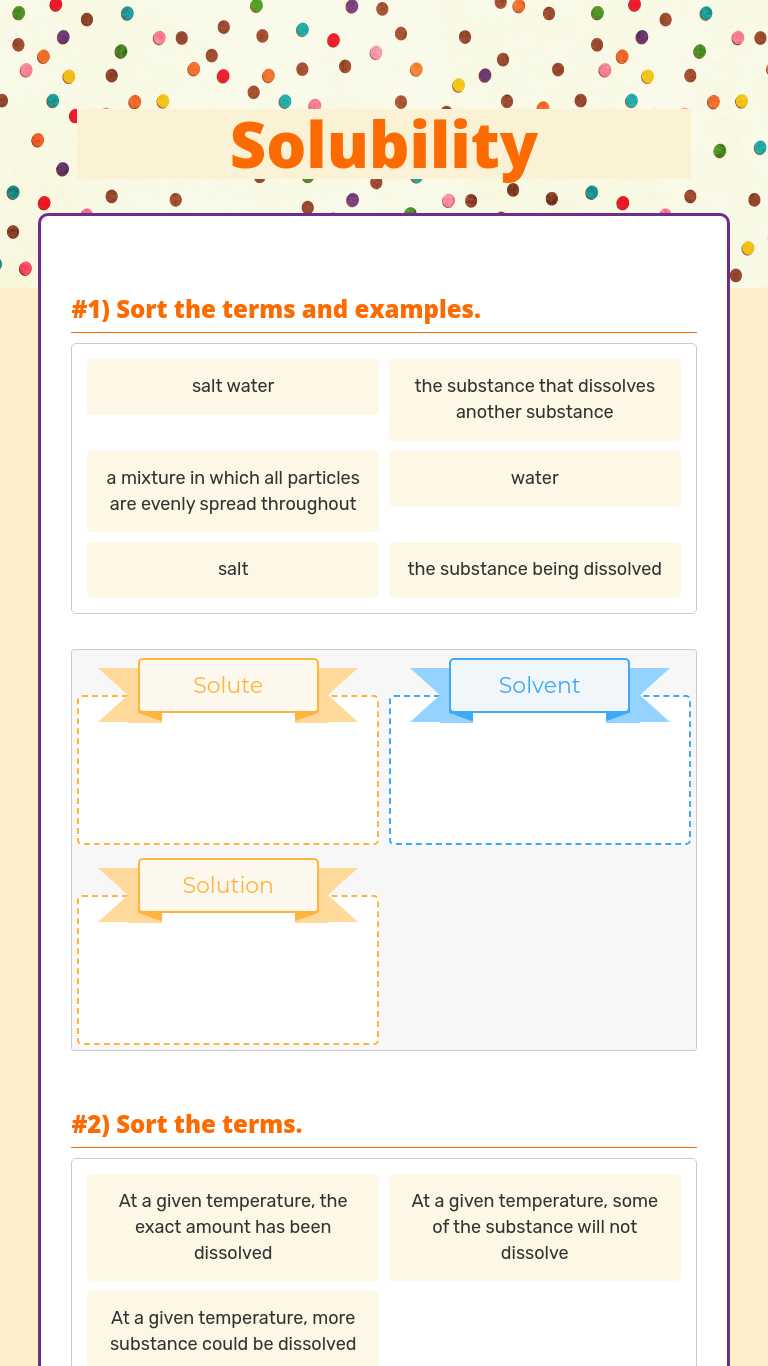 Solute And Solvent Worksheets & Teaching Resources | TpT Introduction to Solutions -- Worksheet Set (Solutes, Solvents, and Saturation) by Chemistry Wiz 4 $3.00 PDF Teach your students about solutions and solubility using this great, detailed set of worksheets! This worksheet set guides students through the following topics:What is a solution? Identifying solutions.