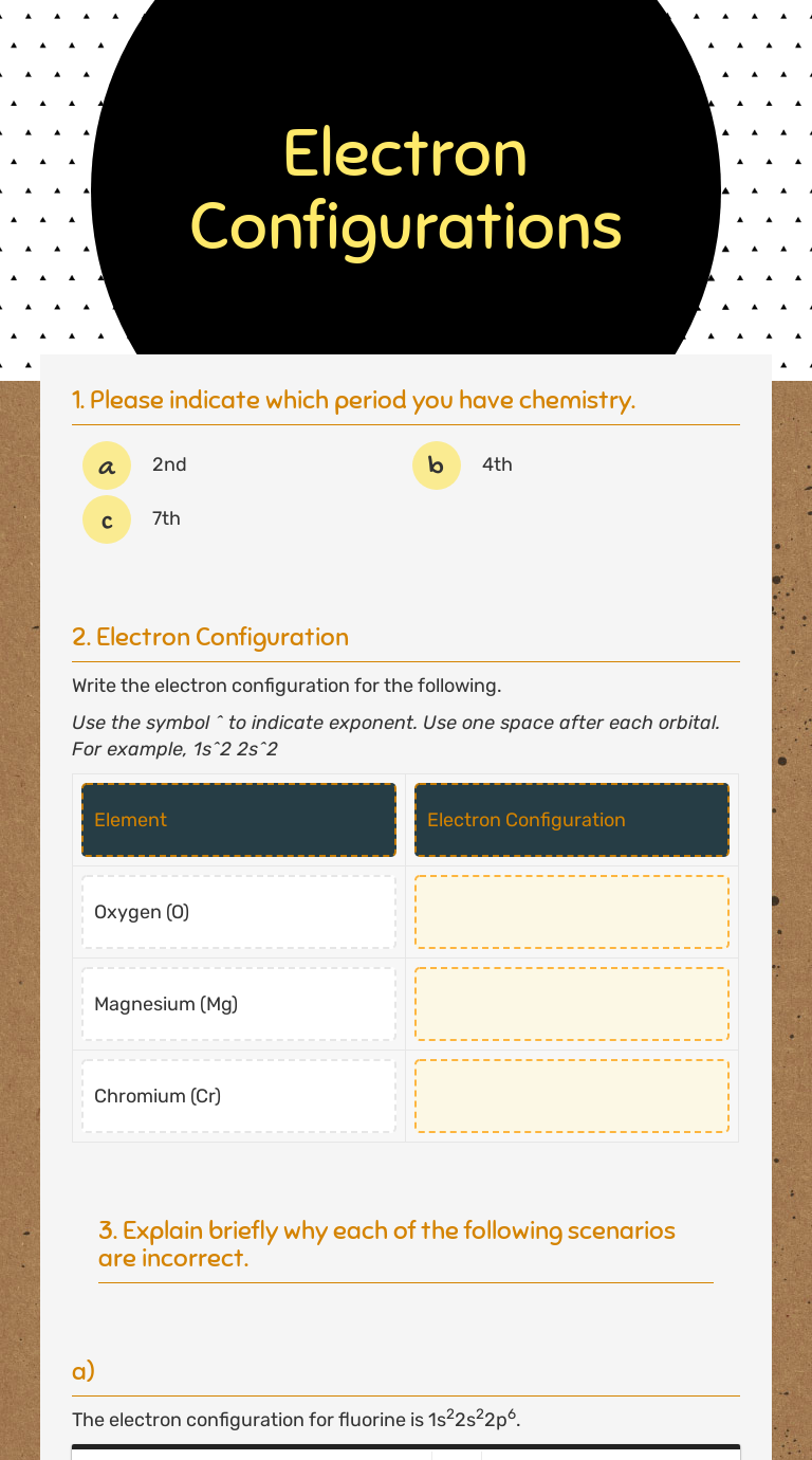 Electron Configuration Chemistry Worksheet Answers ... Jan 09, 2022 · Electron Configuration Chemistry Worksheet Answers When used prior to a noun, determiners help in the noun’s change. Nouns are changed by determiners, which existing circumstances and also take the noun on their own. The worksheet is critical to a youngster’s psychological development.