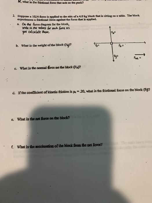 Coefficient of Friction Worksheet Name: Block: Net force and Coefficient of Friction Worksheet 1. Suppose a 10 N force is applied to the side of a 4.0 kg block that is sitting on a table. The block experiences a frictional force against the force that is applied. a. b. c. d. e. f. g. Draw a free body diagram for the block?