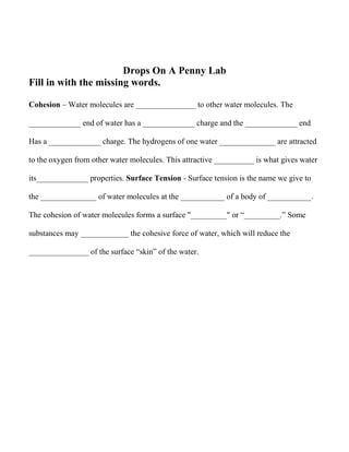 BIOLOGY PENNY LAB - SlideShare Drops On A Penny Lab Cohesion Water molecules are attracted to other water molecules. The oxygen end of water has a negative charge and the hydrogen end has a positive charge. The hydrogens of one water molecule are attracted to the oxygen from other water molecules. This attractive force is what gives water its cohesive properties.