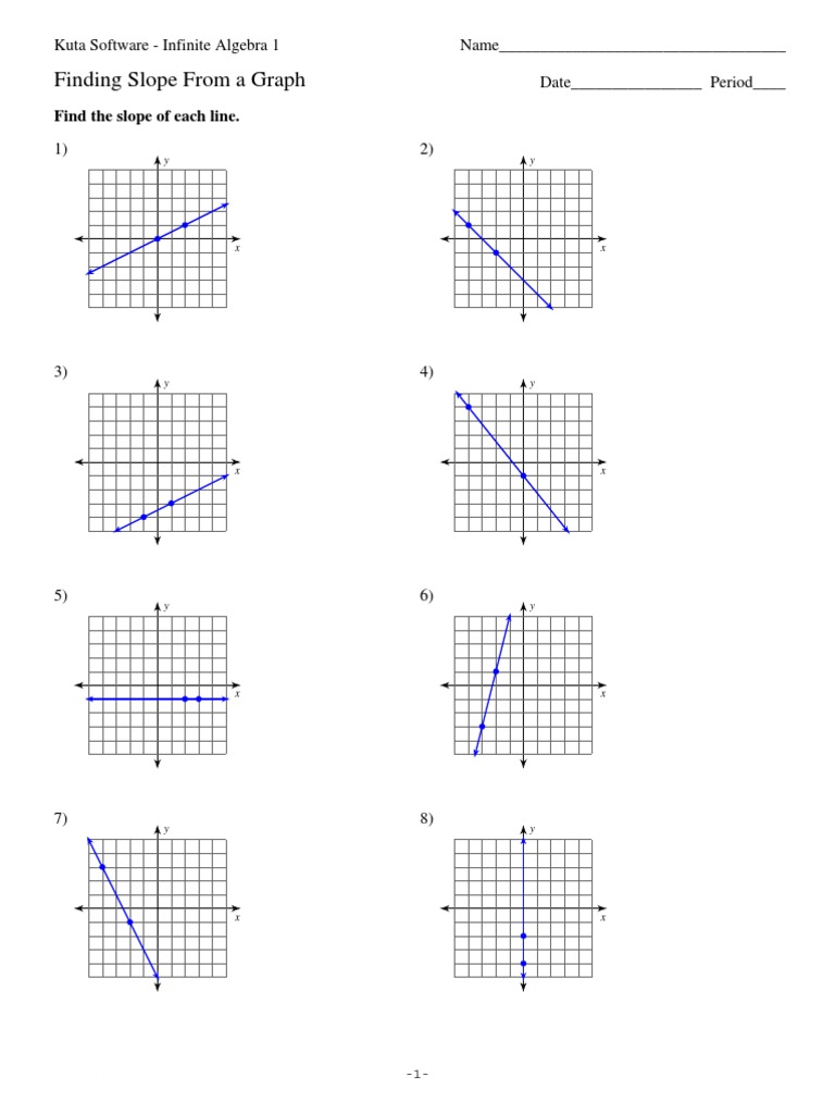 PDF Slope From a Graph.ks-ia1 - cdn.kutasoftware.com L Worksheet by Kuta Software LLC Kuta Software - Infinite Algebra 1 Name_____ Finding Slope From a Graph Date_____ Period____ Find the slope of each line. 1) x y 2) x y 3) x y 4) x y 5) x y 6) x y 7) x y 8) x y-1- ©r B2N0w1y2 D nK ru0thay gS SoYf1tPwLasr meq aL4L1Cs. i 2 bA NlblG Trti bgghFtCsd zr vevs se Pr wvreidp. f 9 ZMca sd0e R 2wHist 9hf ...