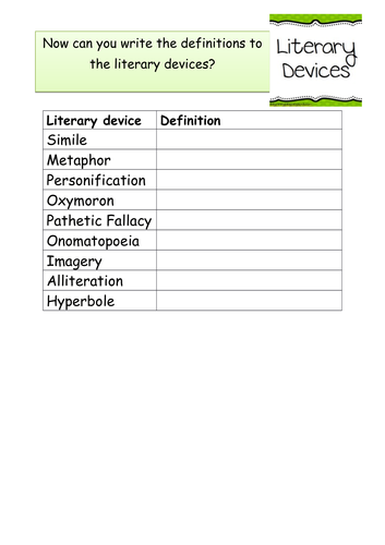 Literary Devices Worksheet | Teaching Resources Literary Devices Worksheet. Subject: English. Age range: 14-16. This worksheet has multiple purposes. The first is for students to remind themselves about the literary devices. The second is that they may for any given text identify an example so that while revising, the can jog their memory on...