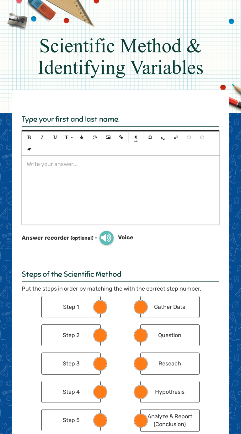 Scientific method variables (worksheet) - SlideShare Scientific method variables (worksheet) 1. Name: _____ A student was doing an experiment using the scientific method. A picture of the student's project is shown below. 1. What is the student's change variable? a. the angle of the light shining on the light b.