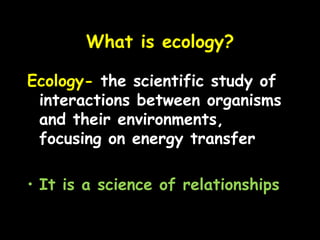 basic ecology notes ppt worksheet Flashcards - Quizlet basic ecology notes ppt worksheet STUDY Flashcards Learn Write Spell Test PLAY Match Gravity Created by FutureIdol Terms in this set (32) ecology the study of interaction between organsims and their enviroment focusing on energy transfer biotic factor all living organsims inhabiting the earth abiotic factors nonliving parts of the enviroment