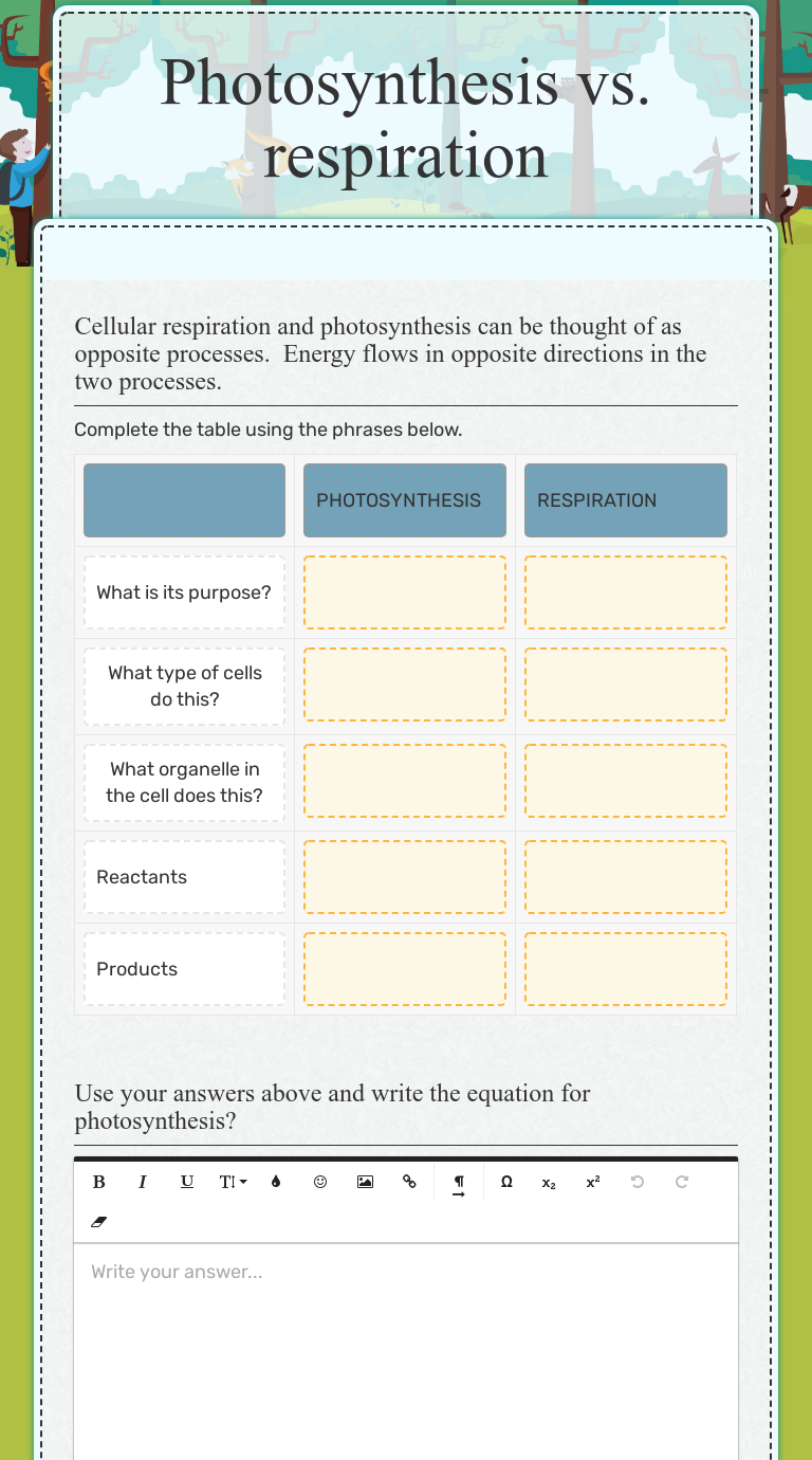 Photosynthesis And Cellular Respiration Worksheet Answers ... Photosynthesis and cellular respiration worksheet answers. Water carbon dioxide go into photosynthesis and water and carbon dioxide come out of cellular respiration.