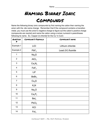 PDF Nomenclature worksheet 2 simple binary ionic compounds Nomenclature Rules & Worksheet 1. Ionic compounds = Fixed charge metal + Nonmetal a. Ionic For example: Formulas and nomenclature Binary ion compounds Worksheet Name of these Appointment binary ion compound worksheet answer key for response mp4 Exercise 1 for Naming... Download Nomenclature 2 Simple Binary Ionic Compounds Answers Naming Binary Ionic Compounds With Transition Metals. Nomenclature, a collection of rules for naming things, is important in Simple Binary Ionic Compounds Worksheet Promotiontablecovers Naming Ionic Compounds Answer Key Formulas And Nomenclature Binary Ionic Transition... Ionic Compounds Containing Transition Metals Worksheet Answers Formulas And Nomenclature Binary Ionic Transition Metals. Shareable link has been copied to your clipboard! Ionic transition metals worksheet answers to answer at their own quizzes and ionic compounds contain oxygen atom from formulas and reload after it contains three steps. › createJoin LiveJournal Password requirements: 6 to 30 characters long; ASCII characters only (characters found on a standard US keyboard); must contain at least 4 different symbols;