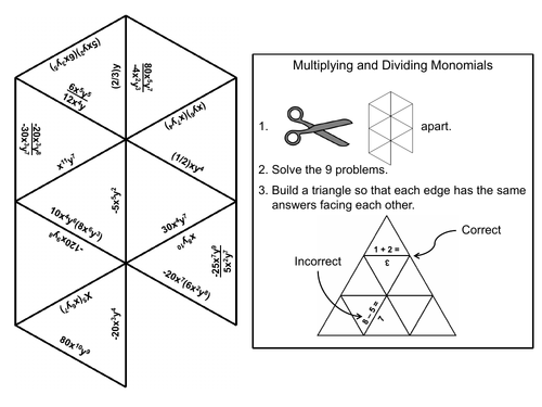 Multiplying Monomials Worksheets | Education.com It sounds confusing, but these multiplication problems with monomials will help your student learn them front and back! She can see the example to learn how to do it and check her work with each answer sheet. Download all (5) Click on a worksheet in the set below to see more info or download the PDF.