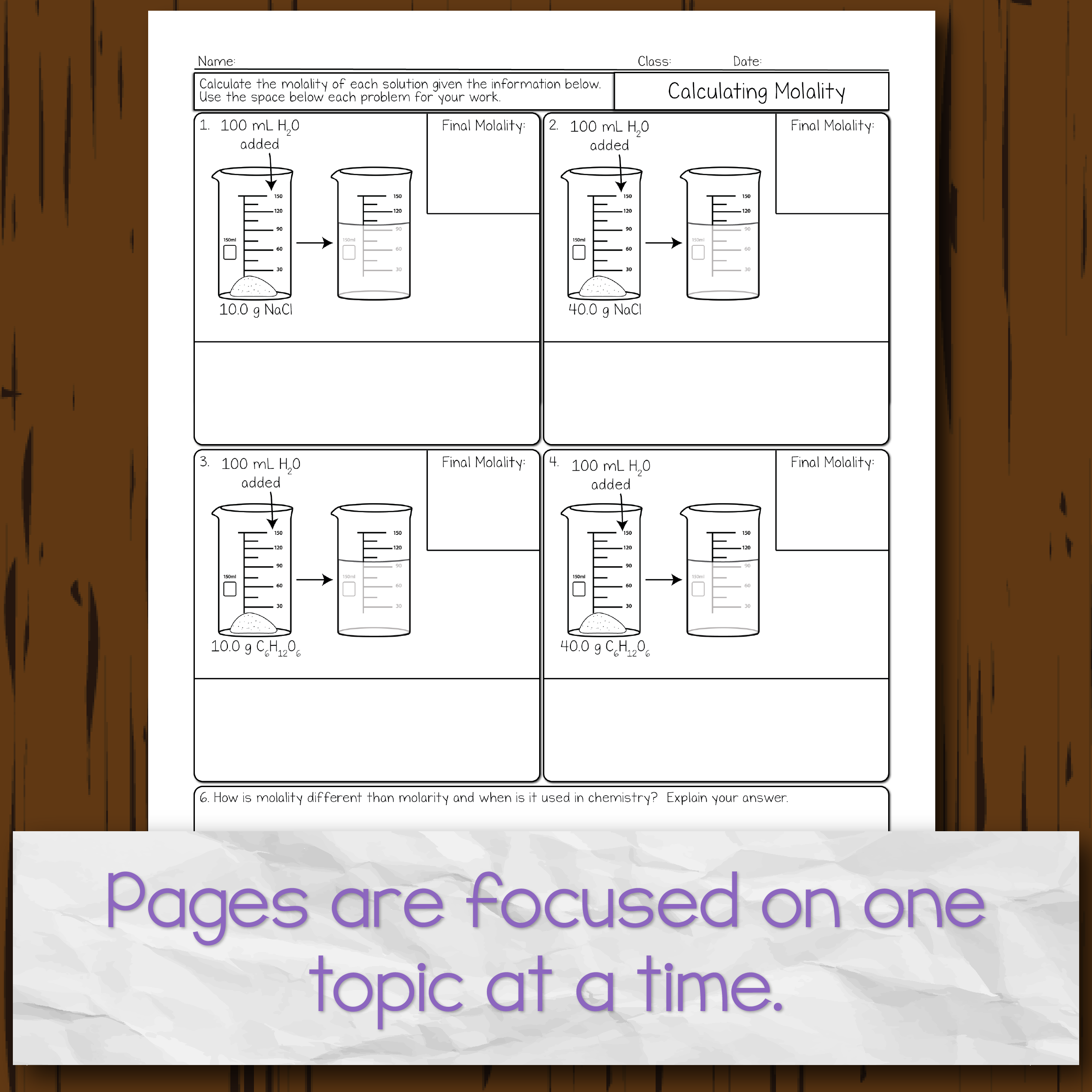 PDF Chemistry Molarity Of Solutions Worksheet Answer Key Chemistry Molarity Of Solutions Worksheet Answer Key MolaritY Practice Worksheet Find the molarity of the following solutions: 4) 0.5 moles of sodium chloride is dissolved to make 0.05 liters of solution. 0.5 grams of sodium chloride is dissolved to make 0.05 liters of solution. 0.5 grams of sodium chloride is dissolved to make 0.05 ml- of ...