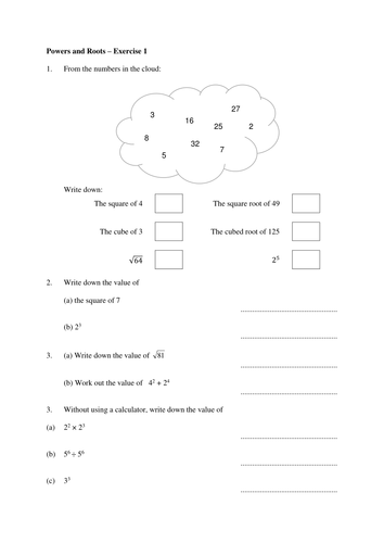 Powers And Roots Worksheet - GCSE Maths [FREE] - Third ... Section 1 of the powers and roots worksheet contains 36 skills-based powers and roots questions, in 3 groups to support differentiation Section 2 contains 4 applied powers and roots questions with a mix of worded problems and deeper problem solving questions Section 3 contains 4 foundation and higher level GCSE exam style powers and roots questions