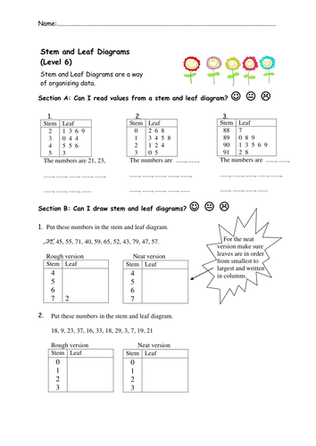 Stem and Leaf Diagrams Worksheets. | Teaching Resources docx, 90.83 KB KS3-4 (11-16 year olds) Write-on Worksheet split into three sections, reading values from stem and leaf diagrams; drawing stem and leaf diagrams and calculating averages from stem and leaf diagrams. One version has more structure to it. Now also included are versions with the keys on. Creative Commons "Sharealike" Reviews