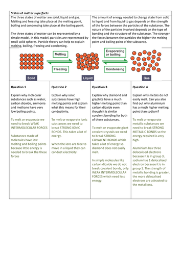 What's the MatterDo Things Keep Changing? [10th-12th grade] States of Matter Partner Quiz: Quiz over the states of matter and their properties. Tests: Culminating test to ask some basic knowledge, but three prompts at the end: Test Form A: Explain how aluminum could undergo a physical change. A chemical change. Construct a heating curve for a substance that is heated to 150°C. The substance Matter Activities for High School Chemistry | Study.com Option 1 - Technology. Computers - Internet, Microsoft Word (or other typing program), and PowerPoint or Google Slides. Screen with projector. Option 2 - Without technology. Large poster board ... States of Matter (examples, answers, activities, experiment, videos) Learn the basics about the three well-known States of Matter - solids, liquids and gases. What is a state of matter? and what are properties of solids, liquids and gases? The particle theory is used to explain the properties of solids, liquids and gases. The strength of bonds between particles is different in all three states. States Of Matter Worksheets - TheWorksheets.CoM - TheWorksheets.com • Matter is made up of particles too small to be seen. • The three states of matter are solid, liquid, and gas. • Solids, liquids and gases can be characterized by their properties (including volume, shape, and the movement and spacing of particles). • Different densities of water, or solutions, will stratify to form layers.