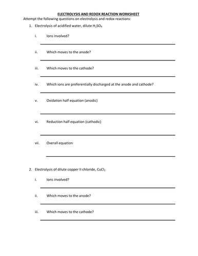 Oxidation and reduction: redox reactions • Science | GCSE.CO.UK Redox Definition One: Oxygen Transfer. One of the oldest definitions of oxidation and reduction involves oxygen transfer. Oxidation is simply the gain of oxygen, while reduction is the loss of oxygen. For example, consider the following chemical reaction: 2 M g + O 2 → 2 M g O. 2 \mathrm {Mg}+\mathrm {O}_ {2} \rightarrow 2 \mathrm {MgO} 2Mg + O2. Chapter 20 Oxidation Reduction Reactions Worksheet will be used to develop a clear picture of this classification.05.07.2022 · The reactions in which oxidation (loss of electrons) and reduction (gain of electrons) take place simultaneously are called redox reactions. Magnesium is getting oxidised Balancing Chemical Reaction Worksheet Answers The right hand side as well as water to start on either a complete ionic reactants and practice questions, one of element that they ought to. Types of Chemical Reaction Worksheet CH 7 Name Balance. And reactions test answer key balancing equations worksheet and key 7 23 09 revision notes on chemical reactions and equations aqa 9 1 gcse combined. Worksheets Class 11 Chemistry Redox Reactions Answer Question. The oxidation number of carbon in CH2 Cl2 is (a) 0 (b) +2 (c) +3 (d) +5 Answer Question. Pure water is bad conductor of electricity because (a) It has high boiling point (b) It is almost unionised (c) Its molecules are associated with H- bonds (d) Its pH is 7 at 25°C Answer Question.