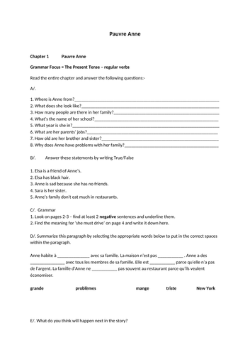 PAUVRE ANNE Chapter 1 Worksheet by La classe de Mlle Roulo | TpT PAUVRE ANNE Chapters 1-9 Worksheet BUNDLEAccompanying worksheets for the novel Pauvre Anne by Blaine Ray. These are two-sided and one-sided PDF worksheets for all 9 chapters. Answer keys included for all chapters.This worksheet contains the following question types such as:Vrai ou Faux? CrosswordsW 10 Products $ 17.00 $ 19.00 Save $ 2.00