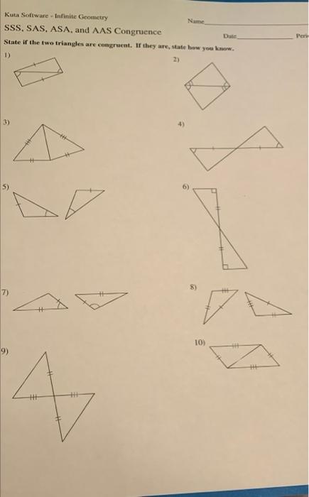 4-SSS, SAS, ASA, and AAS Congruence - Kuta Software ©4 f2x0 x1M1W xK LuWtZat uSQolfut9w 0a zroe M 8L TL IC X.N U kA rl dlO 3r2i lg 2hjt rs A NrPeTsyerwvKeydO.G 4 BMpa4dIe 1 XwViKtWhO dIin wfQirnKi YtweH 3G ve 1oLm Se rt xr8y t.v Worksheet by Kuta Software LLC Kuta Software - Infinite Geometry Name_____ SSS, SAS, ASA, and AAS Congruence Date_____ Period____