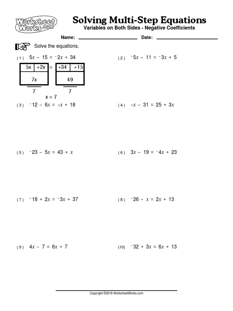 Worksheet Works Com Solving Multi Step Equations Download Free Worksheet Works Com Solving Multi Step Equations. These worksheets can be used by students in the 5th-8th grades. These two-step word puzzles are constructed using decimals or fractions. Each worksheet contains ten problems. These worksheets are available both online and in printed. Multi-Step Equation Worksheets - Math Worksheets 4 Kids Multi-Step Equation Worksheets. A huge collection of printable multi-step equations worksheets involving integers, fractions and decimals as coefficients are given here for abundant practice. Solving and verifying equations, applications in geometry and MCQs are included in this section for 7th grade and 8th grade students. 9+ solving multi step equations worksheet answers algebra 2 with work ... Descriptions: Worksheet by Kuta Software LLC. Kuta Software - Infinite Algebra 2 … Solving Multi-Step Equations. Solve each equation. 1) 4n − 2n = 4. {2}. More : Worksheet Works Solving Multi Step Equations Answers Multi Step Equations Worksheets Math Monks. Multi Step Equations Notes And Ws. Multi Step Equations Worksheets Math Monks. Multi Step Equations Notes And Ws. 7th Grade Mathematics Distance Learning Packet. Solving Multistep Equations With Variables On One Side Worksheet. More Solving Multi Step Equations You. Solving Equations Mixed Review ...