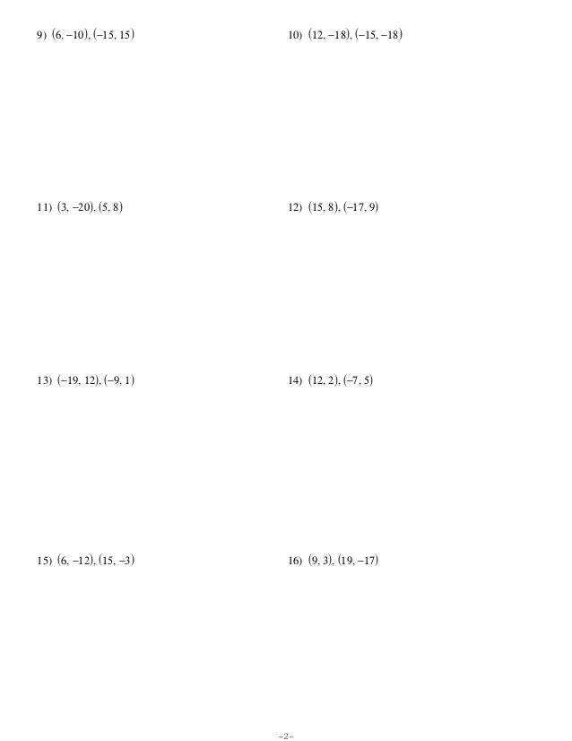 Slope of a Line from a Graph Worksheets | Math Worksheets Slope of a Line (Graphed Points) Worksheet 1 - Here is a 9 problem worksheet where you will asked to find the rise and run between two points on a line, then determine the slope of the line. All of the slopes on this worksheet are positive values. Slope of a Line Worksheet 1 RTF Slope of a Line Worksheet 1 PDF View Answers PDF Algebra 1 - Write the Equation of the Line Given two points Write the Equation of the Line:Given two points Write the slope-intercept form of the equation of the line through the given points. 1) through: (0, ... F B XAAl bl3 2rci dg fhlt qs 9 er 7efs ueTr 6v9e wd8.J 4 xMa7d QeC kwLiUtghj YIanLfni8nUiitPe5 6A7l vg qesb yrba 2 01v. O Worksheet by Kuta Software LLC Algebra 1 ID: 1 Finding Slope From Two Points Practice 2 worksheet Finding Slope From Two Points Practice 2Finding Slope From Two Points Practice 2. ID: 1792226. Language: English. School subject: math. Grade/level: 9-12. Age: 13-18. Main content: Slope. Other contents: Add to my workbooks (10) Distance between Two Points Worksheets - Tutoringhour.com Ascend the skill-building ladder with our free printable distance between two points worksheets that provide adequate practice in applying the formula to calculate how far any two places are from each other using their coordinates. For instance, let's assume the coordinates of Beach Street are (8, -1) and the coordinates of Canal Street are (3 ...