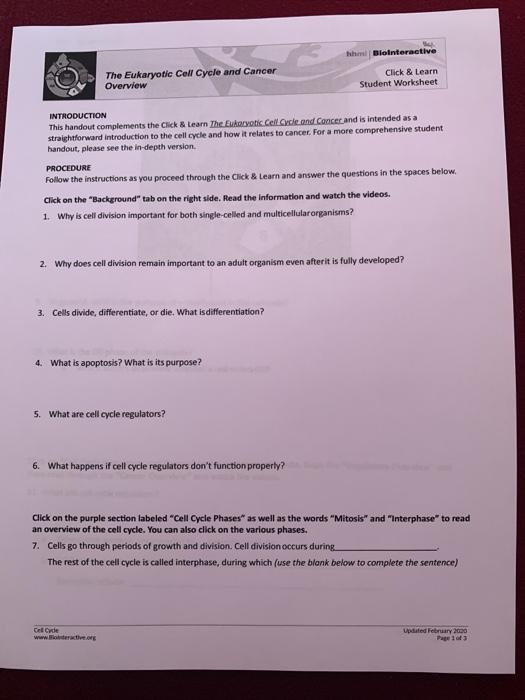 Topic 6 Eukaryotic Cell Cycle and Cancer Exploration Worksheet ... cancer exploration worksheet answer key for topic 6 on cell cycle and cancer. the eukaryotic cell cycle and cancer in depth click learn student worksheet. HHMI Cell Cycle and Cancer Overview Worksheet - StuDocu An Assignment given to us for our module on Cancer and the cell cycle and how the two interact julian delamaza bsci introduction this handout complements ...