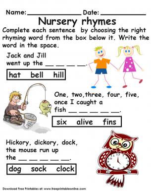 Browse Printable Rhyming Word Worksheets | Education.com Print out our rhyming worksheets, which are a terrific resource to help young children achieve early phonics and reading proficiency. With cut and paste activities, nursery rhyme coloring pages, fill in the blank exercises, matching games, and more, your child will never frown when he sits down and has tons of fun with our rhyming worksheets. Rhyming Words for Kindergarten | Lesson Plan | Education.com Explain that rhyming words are words that have the same ending sounds. For example, "cat" and "hat" are rhyming words. Read aloud some entries from your book of nursery rhymes, and emphasize the rhyming words as you go along. After each rhyme, ask students to tell you what rhyming words they noticed.