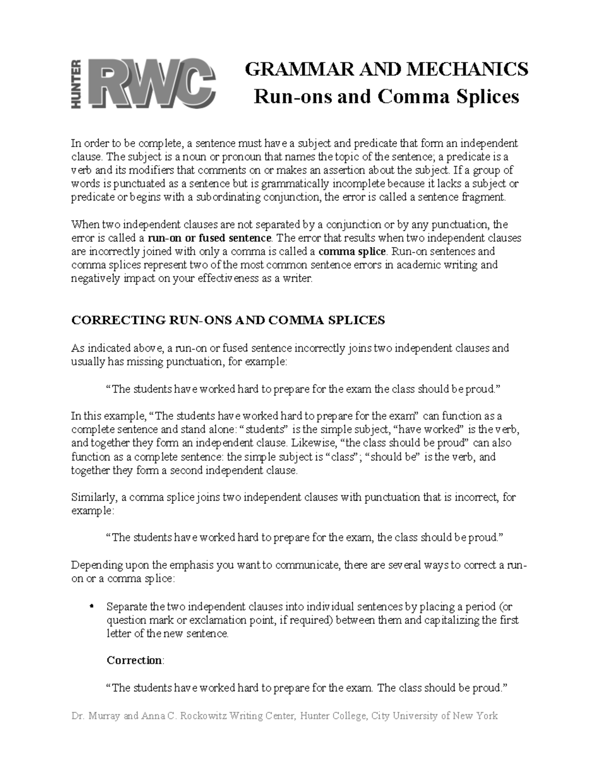 Run-On Sentences and .Comma Splices Run-On Sentences and .Comma Splices. A run-on sentence is two (or more) sentences written together without any punctuation between them. A comma splice is ... FIX RUN ON SENTENCES - WORKSHEET 1 | ESL Writing FIX RUN ON SENTENCES - WORKSHEET 1. Below are examples of fused sentences and comma splices. Part A. Fix each sentence two times: 1) once with a period and ... Run-ons: Fused Sentences and Comma Splices - Columbia College Solution 1: Separate the two independent clauses into two sentences. Example: Margaret Atwood is best known for her novels. Her essays and poems are also worth ...
