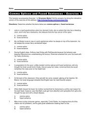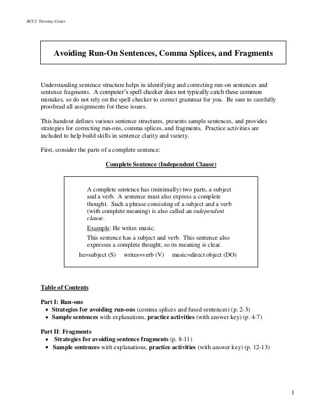 Avoiding Run-On Sentences, Comma Splices, and Fragments Strategies for avoiding run-ons (comma splices and fused sentences) (p. 2-3). Sample sentences with explanations, practice activities (with answer key) (p. Comma Splice - Grammar Worksheets If you would like the answers to all the worksheets (total of 20 different topics), along with tips ... Comma Splices, Fused Sentences, and Run-on Sentences.