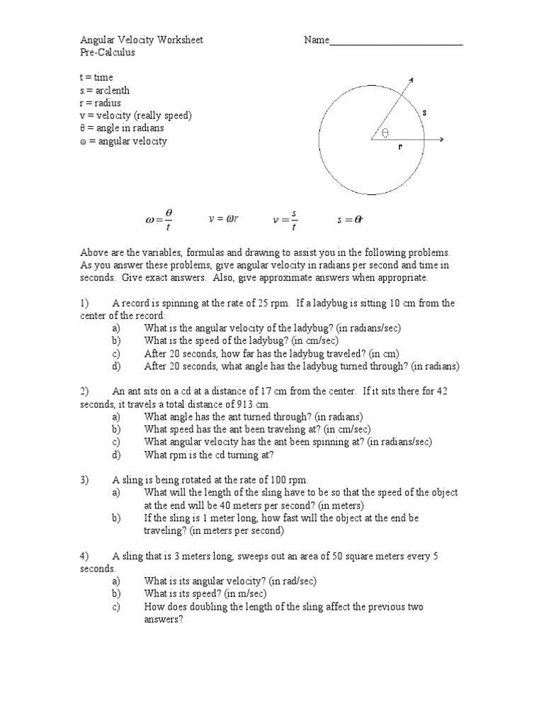Angular and linear velocity worksheet. Arc Length, Area of Sector of a Circle, Angular and Linear Velocity ... Arc Length, Area of Sector of a Circle, Angular and Linear Velocity Worksheet. Name___________________________________. SHORT ANSWER. Section 2.3 – Linear and Angular Velocities - mrsk.ca A bicycle wheel with a radius of 13.0 in. turns with an angular velocity of 3 radians per seconds. Find the distance traveled by a point on the bicycle tire in ... 4 in. s Pre-Calculus Arc Length, Linear/Angular Velocity Notes Name wheels rotate at 1 0 rpm, find the speed at which she is traveling in mi/hr. Page 3. Pre-Calculus. Arc Length, Linear/Angular Velocity Homework Worksheet. 1 ... 11_8Linear and Angular Velocity - Answers (1) A flywheel mounted on an engine crankshaft has a radius of 6 inches. If the engine is running at. 2800 rpm, what is the linear velocity of a point on the outer ...