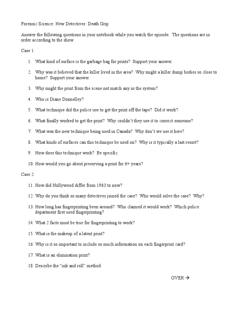 Death - Mrs. Peppler's Forensic Science Class How to Calculate Time of Death. Of Maggots & Murder Lab Activity. Answer Key. 13-1 Lab Activity - Age of Skulls. Answer Key. 13-2 Lab Activity - Male or Female Bones. Answer Key. 13-6 Lab Activity - Medical Examiners Findings. 13-7 LAB ACTIVITY - CANNONS OF PROPORTIONS. worksheet 1 Flashcards - Questions and Answers | Quizlet functions of blood. connective tissue; approx 5 liters in average adult. plasma. liquid part of blood (55%); 90% water; also contains proteins (9%), nutrients, gases, protective substances & waste products. whole blood. red blood cell (RBC); biconcave; transport O2 to cells via hgb. hemoglobin.