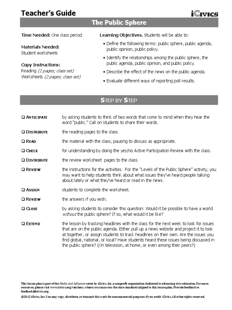The Public Sphere Define the following terms: public sphere, public agenda, ... This lesson plan is part of the Media and Influence series by iCivics, ... Worksheet p.1.