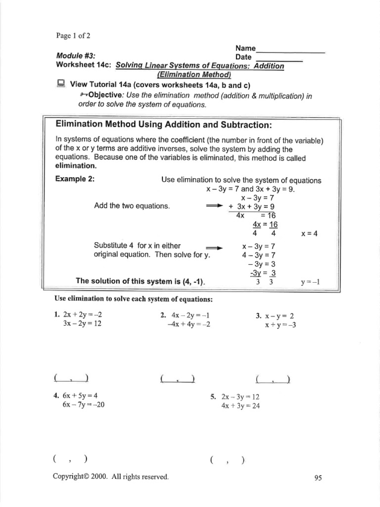 Solving Systems of Equations Worksheets with Two Variables Gain immense practice with this batch of printable solving systems of equations worksheets, designed for 8th grade and high school students. Find adequate exercises to solve a set of simultaneous equations with two variables using the graphing method and algebraic methods like the substitution method, elimination method, cross-multiplication method. Algebra 1 - MRS. REED'S MATH CLASS Elimination (7.3 Practice A) Day 1 Worksheet Answers. Solve Systems of Equations by Elimination Day 2 Notes. ... Solving Systems of Equations with Special Answers Notes. Solving Equation Worksheets - Math Worksheets 4 Kids This segment has an endless collection of equation worksheets based on solving one-step, two-step and multi-step equations; rearranging literal equations, writing the equation of a line in various forms; graphing linear equation and more. High-school topics such as quadratic equation, absolute value equation and systems of equations are also featured here. Practice solving the …