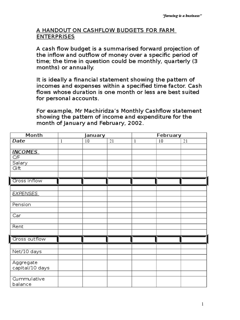 farms.extension.wisc.edu › articles › cash-flowCash flow budgeting – Farm Management The cash flow budget is a valuable planning tool for the farm manager. It enables the manager to know and plan borrowing needs and investment opportunities throughout the year. With a cash flow budget, the manager has an initial cash position for each time period. It can also serve as a communication tool to share with a lender to set up a line of credit, make capital investments, or perhaps ...