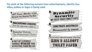 identifying rhetoric ethos pathos logos - TeachersPayTeachers A S. 28. $5.00. PPT. This PowerPoint introduces the rhetorical appeals through the lens of contemporary advertising. Includes definitions, images, YouTube commercials, guided practice, and independent practice/formative assessment where students identify ethos/pathos/logos in magazine ads.