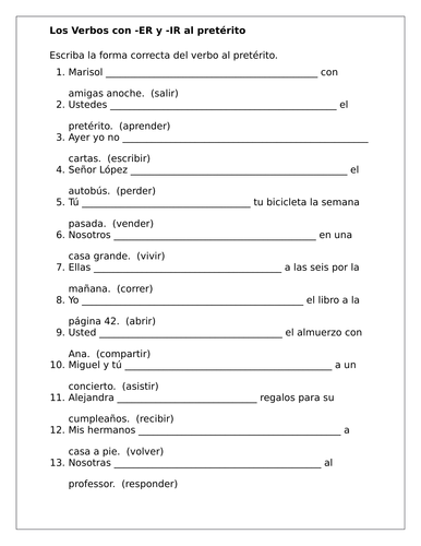 IR ~Spanish verb worksheet ~conjugation ~translation no prep ~to go ... IR ~Spanish verb worksheet ~conjugation ~translation no prep ~to go Description An original hand drawn worksheet. This worksheet gives students an opportunity to practice working with the irregular verb "ir". Students will conjugate the verb, translate (English to Spanish), create a sentence, and work on a 6x6 "ir" sudoku puzzle. No prep! Conjugating -IR Regular Verbs in Spanish (Present) - PDF Worksheet The first exercise includes a list of common -IR regular verbs in Spanish. The first one (ABRIR- to open) has already been conjugated so all they need to do is to conjugate the remaining nine verbs following the same pattern. Please review t he lesson on this topic on our website before working on this worksheet.