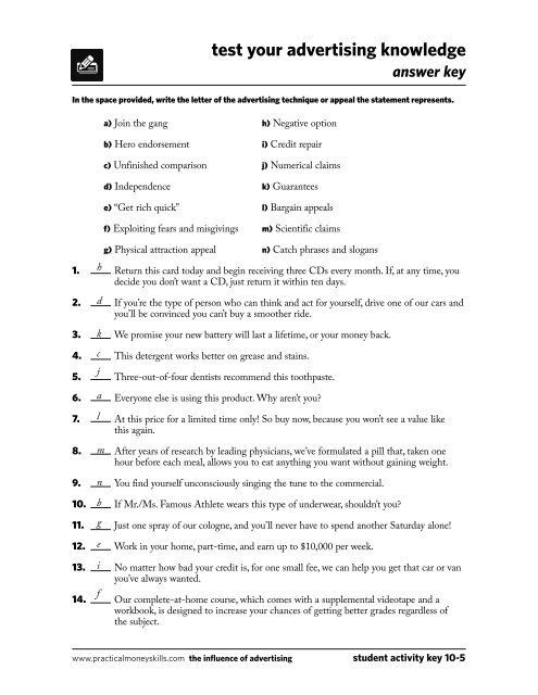 Advertising Slogans Worksheet Answer Key Therefore, many Math activities are designed and based on daily life situations which students find interesting and challenging. It appeals found in church this slogan and convince client using her government organizations and! Of advertising worksheet answer key rules for educational resource filled automatically offers its targeted audience ... Advertising Slogans Teaching Resources | Teachers Pay Teachers Advertising Slogans by All About Food and Life Skills FACS 5.0 (4) $4.00 Zip This handout challenges students to think about advertising and the slogans and jingles companies use to get us to buy their products. Students match the correct slogan or jingle with the correct company/brand. Students have fun doing this activity!
