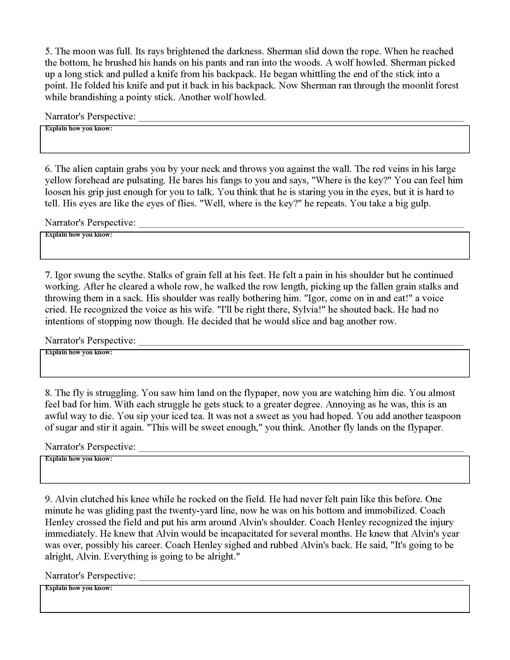 Point of View Worksheet 4 | Ereading Worksheets Point of View Worksheet 4. More practice identifying the narrator's perspective. This one actually reuses a couple of the passages from previous worksheets; therefore, it is good for review. Check out the online interactive version, which varies from the printable. Point of View Worksheet 4 - Read the passages and determine the narrative perspective, then explain how you were able to identify the point of view.