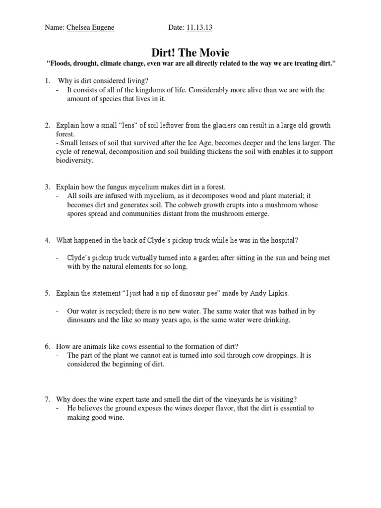 Dirt The Movie Worksheet Answers - 125 Trick Questions With Answers ... The movie takes a humorous and substantial look into the history and. The movie takes a humorous and substantial look into the history and. Floods, drought, climate change, even war are all directly related to the way we are treating dirt. 1. Soil worksheets and teacher notes. Students use this worksheet to guide the movie dirt!