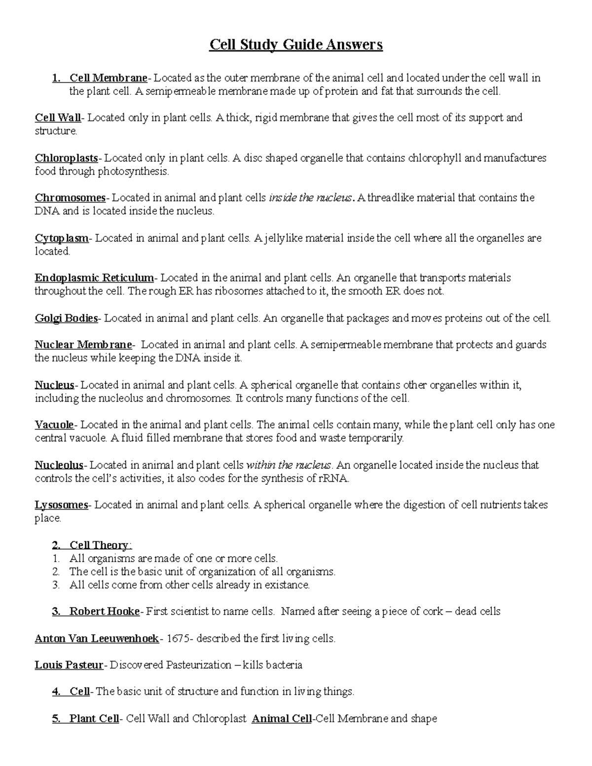 PDF Reinforcement Worksheet - Cell Theory, Scientists, & Cell Types KEY CONCEPT MAIN IDEA: Early studies led to the development of the cell theory. In a phrase, tell what each scientist did to help develop the cell theory. Scientist Contribution to Cell Theory 5. Hooke 6. Leeuwenhoek 7. Schleiden 8. Schwann 9. Virchow 10. What are the three parts of the cell theory? _____ _____ _____ Read the information and answer the ... PDF Cell Review Worksheet - ANSWERS Cell Theory Microscope All Living ... Cell Review Worksheet - ANSWERS Cell Theory 1. What invention was an early step in the discovery of cells? Microscope 2. What are the 3 major principles of the cell theory? a. All Living things are made of one or more cells b. The cell is the smallest unit of life c. All new cells come from preexisting cells 3. PDF CELL THEORY HISTORICAL TIMELINE ACTIVITY - pngisd.org first identified the cell, and Leeuwenhoek made better lenses 5. List the 3 Parts of the Cell Theory: 1) All organisms are made of cells. 2) All existing cells are produced by other living cells. 3) The cell is the most basic unit of life. CELL THEORY LESSON PLAN - Kesler Science At the end of this cell theory lesson plan, students will be able to recognize that according to cell theory all organisms are composed of cells and cells carry on similar functions such as extracting energy from food to sustain life. ... Students who can answer open-ended questions about the lab truly understand the concepts that are being ...